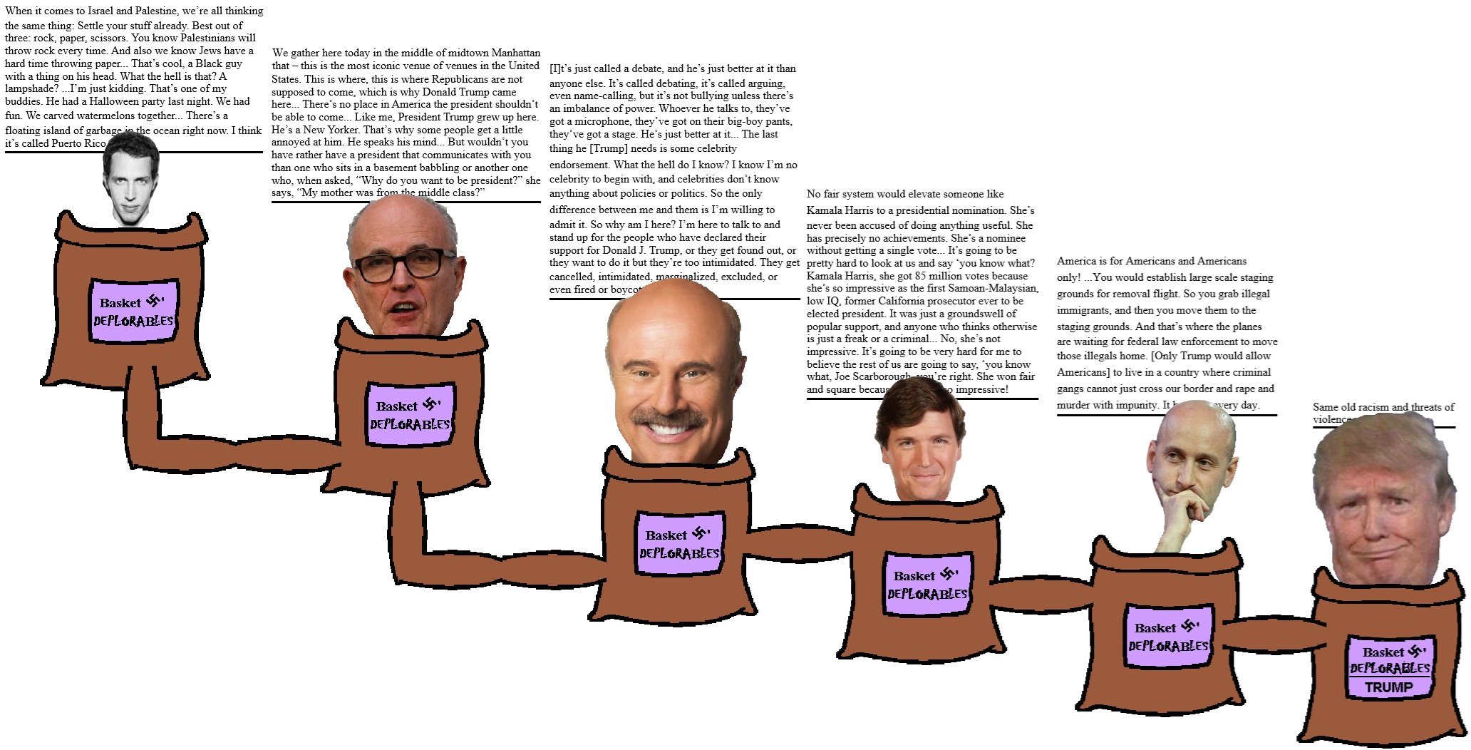The denial was meant to bolster his common person cred, as was his assertion that, like celebrities, he knew nothing about politics and policies. He was a little...confused. But he got back on track with the assertion that regular Americans - like Dr. Phil, who will be signing copies of his new book, I'm OK, You're a Fascist Democratic Commie Bastard!, by the concession stand next to exit G7 after the rally - were being cancelled by censorious lefties. Like Jeff Bezos, who would rather the Washington Post not run an editorial endorsing a candidate in the election than support Kamala Harris. Like Elon Musk, who has turned TwitterX into a cesspool of fascist hate. Or Fox News. Or rabid right-wing talk radio. Or fanatical right-wing blogs. Or zealous right-wing podcasts. Where, oh, where can right-wing Americans find representations of their points of view?