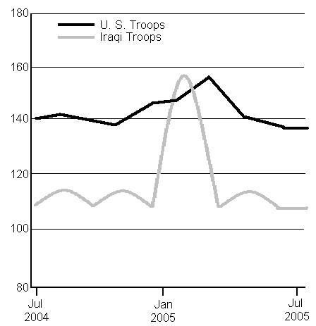The possibility that the United States will be withdrawing many of its troops from Iraq some time in 2006 depends upon the strength of the Iraqi military, as measured by its ability to take over policing duties from American soldiers. A heavy increase in the number of Iraqi soldiers at the beginning of 2005 seemed to indicate that American troop withdrawals could be imminent. However, the number of soldiers who were actually battle-ready (as opposed to the number of Iraqis who donned a military uniform in order to make some money, or just get away from the constant painful moaning of their wounded family members) turned out to be much smaller than reported.