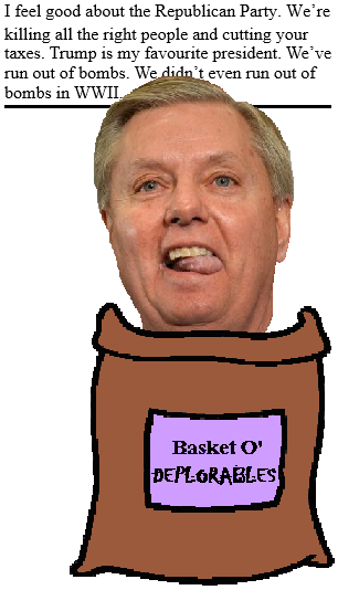 Whether saying it's not the President's job have a war plan ("You know the saying 'you break it you buy it?' I don't buy that one bit.") or whatever this is, "To Donald J. Trump, you just surpassed Ronald Reagan as the most consequential Republican president since Lincoln… You're a Reagan plus, plus, plus," Senator Lindsey Graham has said so many outlandish pro-Trump things lately that it wouldn't be much of an exaggeration to say that he's giving the President a full body ass kissing. Sorry for putting that image in your head. Maybe if you repeat sycophantic psychopathy five times fast, it will drive the image out.
